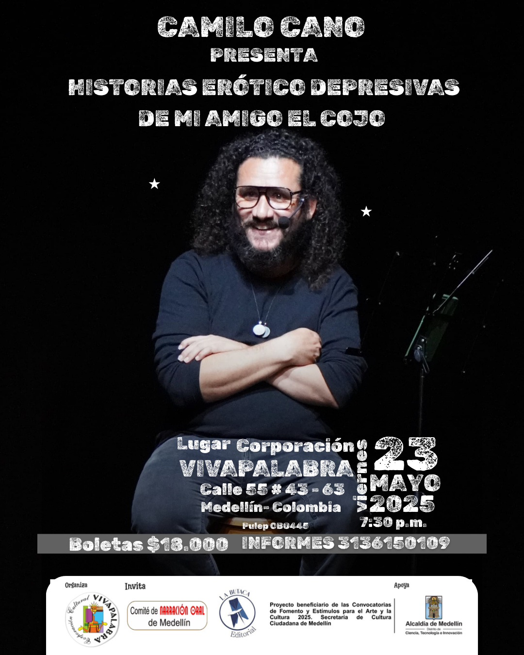 @pepe_cuento nos estará presentando «Historias erótico depresivas de mi amigo el cojo», un espectáculo que integra el humor con historias cotidianas.