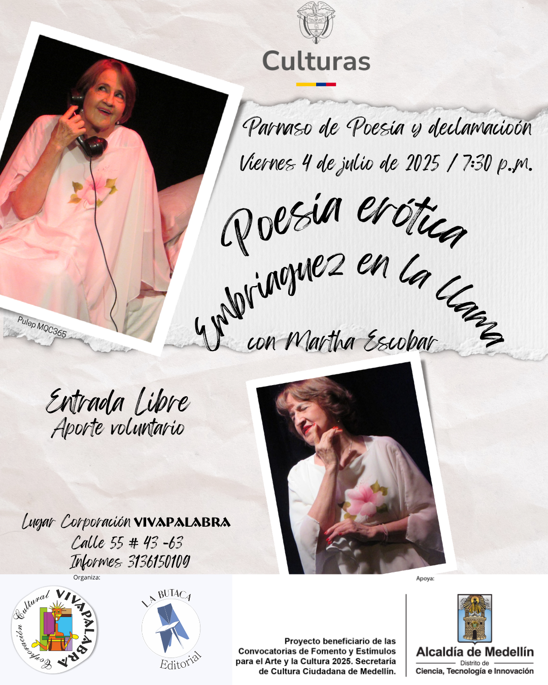 Ven a vivir esta historia de amor donde calla la razón para que hablen los silencios, la sensualidad y el erotismo. Déjate llevar por el ritmo de emociones en el recinto íntimo de Vivapalabra para vivir la poesía erótica con @marthaescobar5422